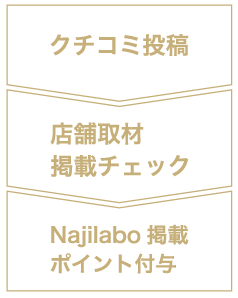 Najilaboは、お店、レジャースポットに投稿できるクチコミ機能が特徴です。グルメ情報はもちろん、ショッピング、レジャー、観光スポットやエステや美容院などのキレイ情報など、多彩なジャンルでクチコミ投稿が可能です。投稿されたクチコミは、編集部の取材・確認等が行われ、各店舗の情報ページに掲載され、すべてのユーザーが共有できます。 ※クチコミ投稿には無料会員登録が必要です。