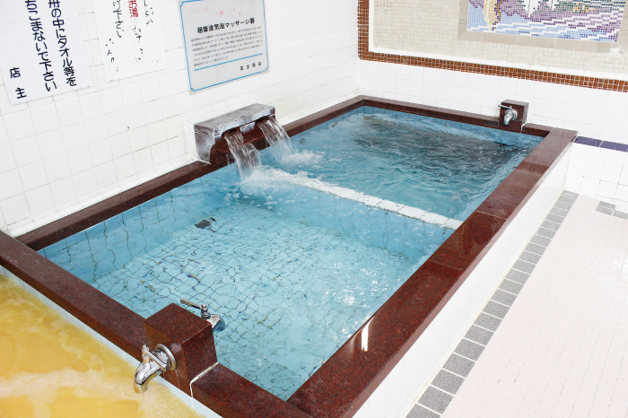 新潟市沼垂に江戸末期から続く、老舗銭湯の「千代乃湯(ちよのゆ)」さん。「日替わり薬湯」を楽しみに、近所はもちろん、遠方から足しげく通う方も多いそうです。私たちの取材中も、開店前からもうすでに常連客の方がやってきたほど。お風呂は「超音波ジェットバス」「ミクロ気泡風呂」そして「日替わり薬湯」の3つからなり、お湯の温度は40~42℃くらい。蛇口も昔懐かしく、冷水、温水が分かれて、プッシュすると出てくるタイプ。