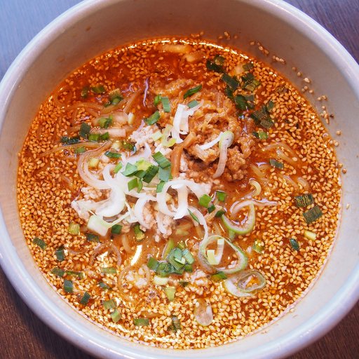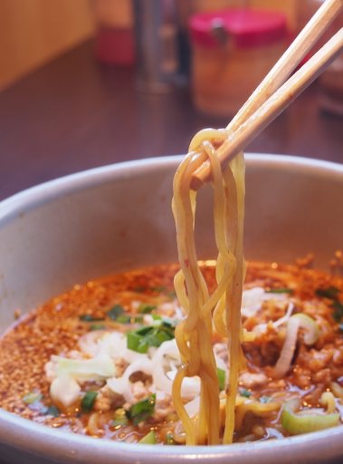 たっぷりの胡麻に覆われた味噌ベースのスープはドロッとした濃厚なもの。上にはたっぷりのネギとひき肉が乗り、ピリ辛のスープ